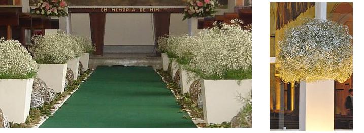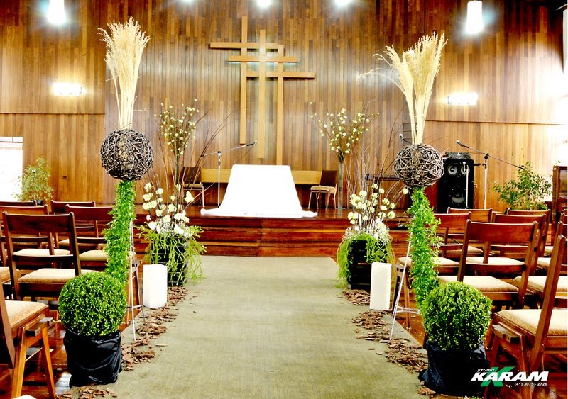 Esses dias, conversando com uma amiga, noiva com eu, começamos a bater um papo sobre decoração, e uma mesma empresa que eu cotei a decoração fez para ela um orçamento 500% mais caro! Claro que você deve estar pensando que cada situação exige um preço diferente, e é exatamente neste ponto que quero chegar. Existem milhões de formas de decorar a Igreja e acredite - você pode gastar pouco, basta pesquisar na internet para obter idéias e principalmente conversar com a florista já com elas em mente, isso fará com que o orçamento fique dentro das suas possibilidades e as dicas e sugestões da empresa também se adequarão melhor ao seu bolso. Abaixo segue algumas dicas práticas de como reduzir os custos com a decoração da Igreja. 1) Como havia dito antes, optem por flores da estação, elas serão mais baratas e estarão mais bonitas. 2) Não é necessário decorar todos os bancos ou cadeiras com arranjos de flores. Decore um e pule dois, completando com tule e laços os demais espaços. Uma outra opção super atual e decorar o corredor com folhas ou pétalas e velas grandes brancas interlacadas com vasinhos baixos de buchinhas (aquelas arvorezinhas redondinhas com folhas pequenas) não custa caro e fica lindo! 3) Ao invés de escolher apenas flores nobres, intercale nos arranjos algumas espécies mais simples como como mini margaridas, cravíneas ou gipsufilas (mosquitinho). 4) Se a cerimônia acontecer ao ar livre, plantas envasadas são ótimas opções para decorar o caminho até o altar. Dependendo das espécies escolhidas, vocês poderão alugar estes vasos, reduzindo bastante o custo. 5) Igrejas que possuem paredes decoradas e outros belos detalhes internos pedem uma decoração mais clean e, conseqüentemente, mais barata. 6) Dependendo da igreja, você poderá conversar com as demais noivas que casarão no mesmo local para dividir os custos da decoração. DICA: Se você não tem idéia de como fazer na sua decoração, então aí vai uma receitinha de bolo que não tem erro, é economia na certa! - Peça um orçamento para 2 arranjos na entrada e 2 no altar (que ficarão ao lado dos noivos), verifique com a florista se ela pode transportar esses mesmos arranjos para o local da recepção, assim você poderá reaproveitá-los na entrada do salão, na mesa do buffet, mesa do bolo etc! - No corredor, ao invés de arranjos, peça um tapete, folhas ou pétalas de rosas com velas no chão e plantas ornamentais. As imagens a seguir traduzem (mais ou menos) essa “receitinha”. Acho que com elas você terá uma boa noção de como é uma decoração de muito bom gosto e mais em conta!